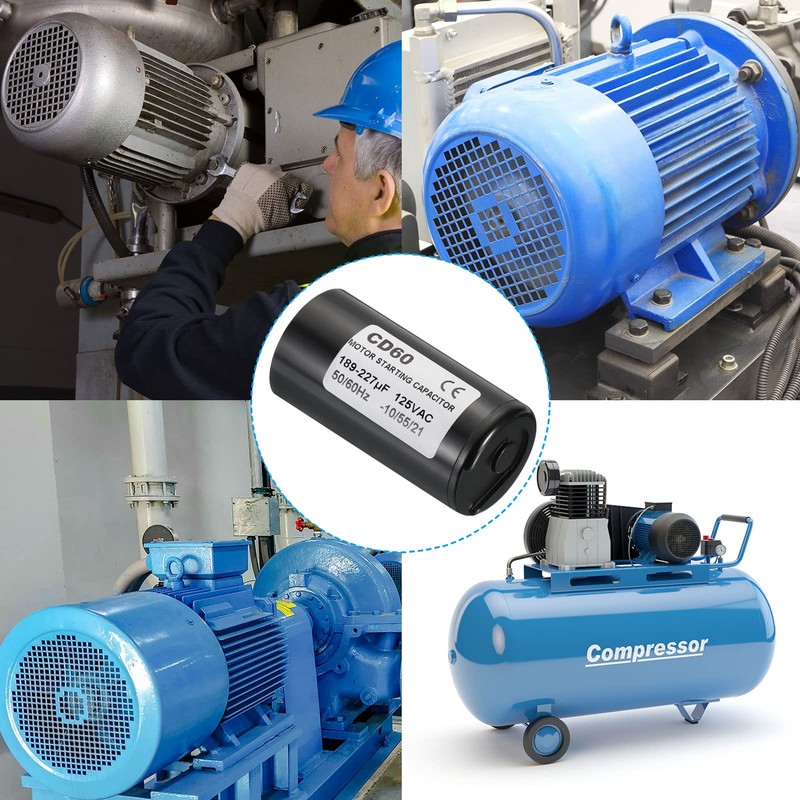 - Application: The CD60 running capacitor is suitable for the start-up of AC motors with frequency of 50Hz and 60Hz, such as air compressors, pressure washers, air conditioners, washing machines, motors, generators, HVAC, fans, compressors, refrigerators, etc.