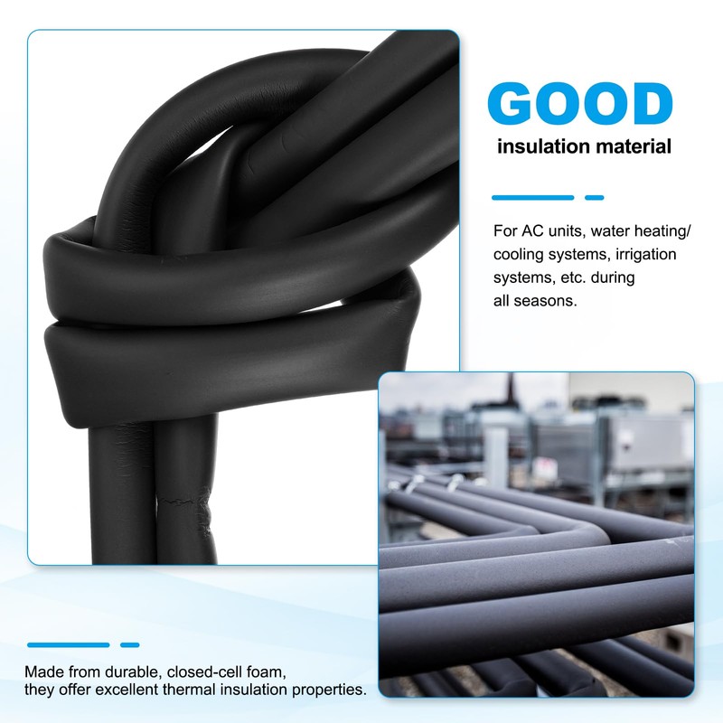 - Application: The pipe Insulation Foam Tube is a good insulation material for insulating pipes for AC units, water heating/cooling systems, irrigation systems, etc. during all seasons. It can also cushion furniture legs to prevent damage from impacts and serve as handle grips on fitness equipment for improved grip and friction
