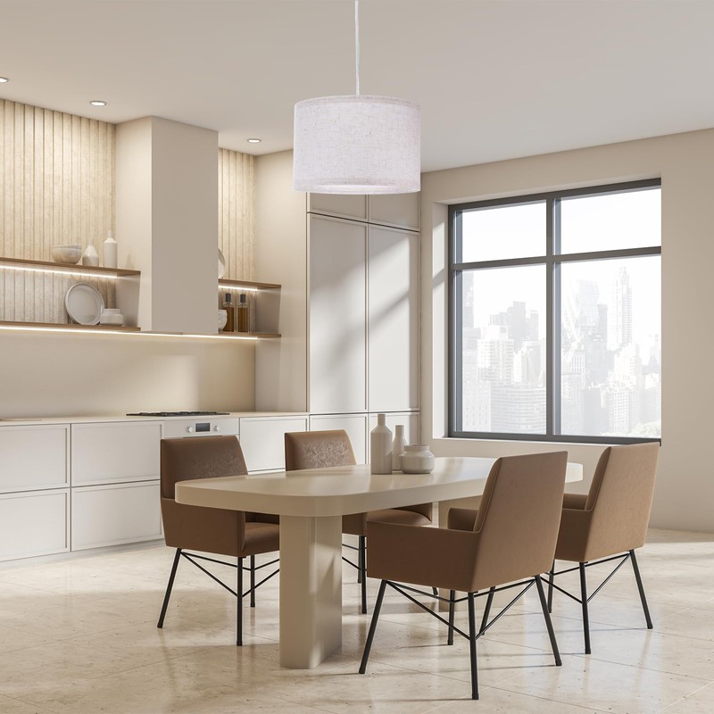 With a natural linen fabric shade, providing a soft and pleasant illumination. The fabric shade adds a touch of elegance and creates a warm atmosphere in dining rooms, living rooms, bedrooms, kitchens, offices, or study areas. (Our drum lampshade is rolled up for better protection and to prevent denting during transport)