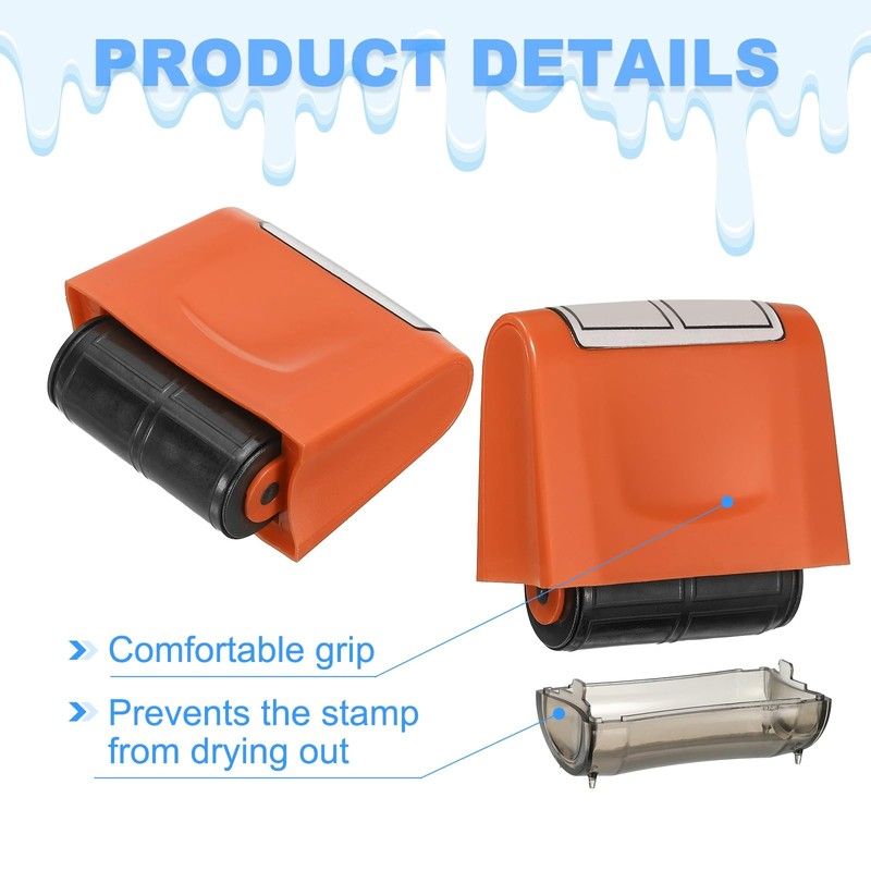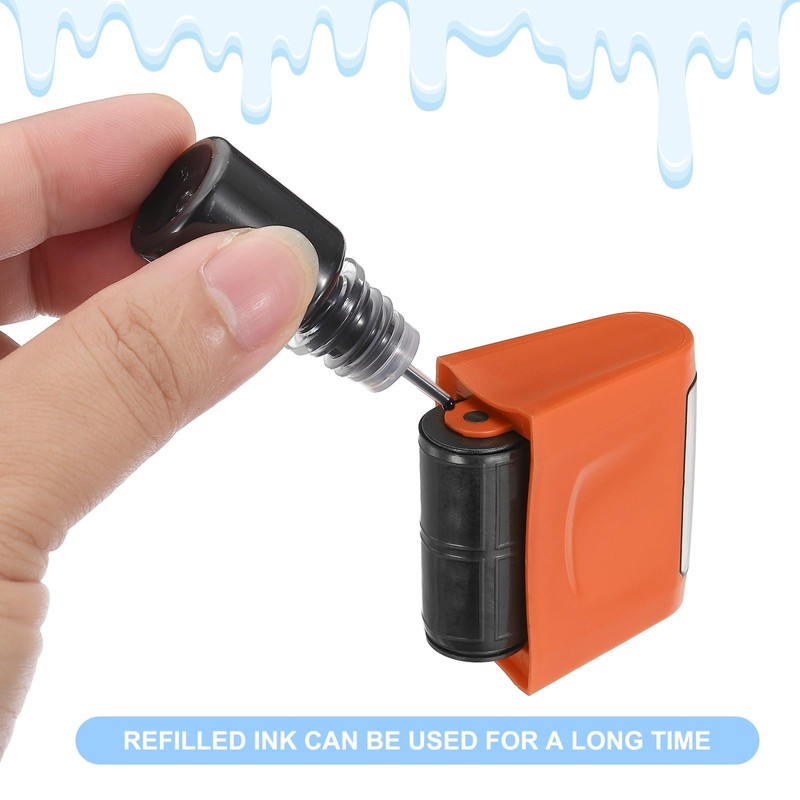 - Specification: Material: Plastic; Color: Orange; Stamp Size: 6.4 x 3.1 x 6.9cm / 2.5 x 1.2 x 2.7 inch ( L * W *H ); Character size: 4.1cm / 1.6 inch; Ink Bottle Size: 5.5 x 2cm / 2.2 x 0.8; inch ( H * W ); Package Content: 1 x Roller Stamp, 1 x Black Oil