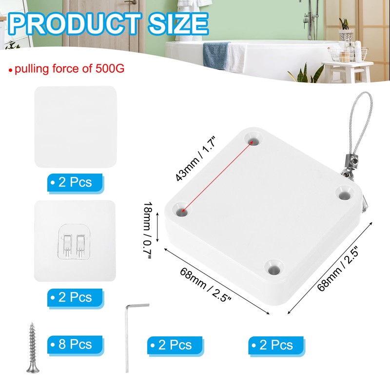 - Color: White; Material: ABS, Steel; Door Closer Size: 63 x 63 x 18 mm / 2.5 x 2.5 x 0.7 Inch(LxWxH); Pull: 500g / 5N; 1.2m / 47Inch; Packing List: 4Pcs x Automatic Sliding Door Closer; Each comes with 4 x Screws, 1 x Wrench + Sticker & Hook Sticker