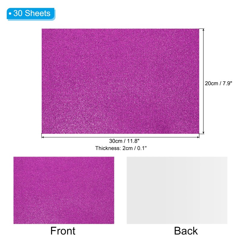 - Material: EVA; Color: Purple; Overall Size: 30 x 20cm / 11.8 x 7.9inch(L*W); Thickness: 2mm / 0.08inch; Package List: 30 Sheets x Glitter Foam Sheet