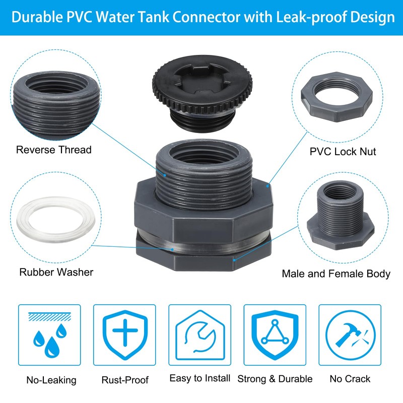 - Advantage: PVC material - The water tank connector fitting, made of PVC, offers durability and rust resistance for a long lifespan in outdoor conditions. Leak-Proof Design - The embedded gasket stays in place securely, ensuring a solid seal. This bulkhead pipe connector boasts a leak-proof design with rubber gaskets that snugly fit against the water tank wall to prevent any water leakage.