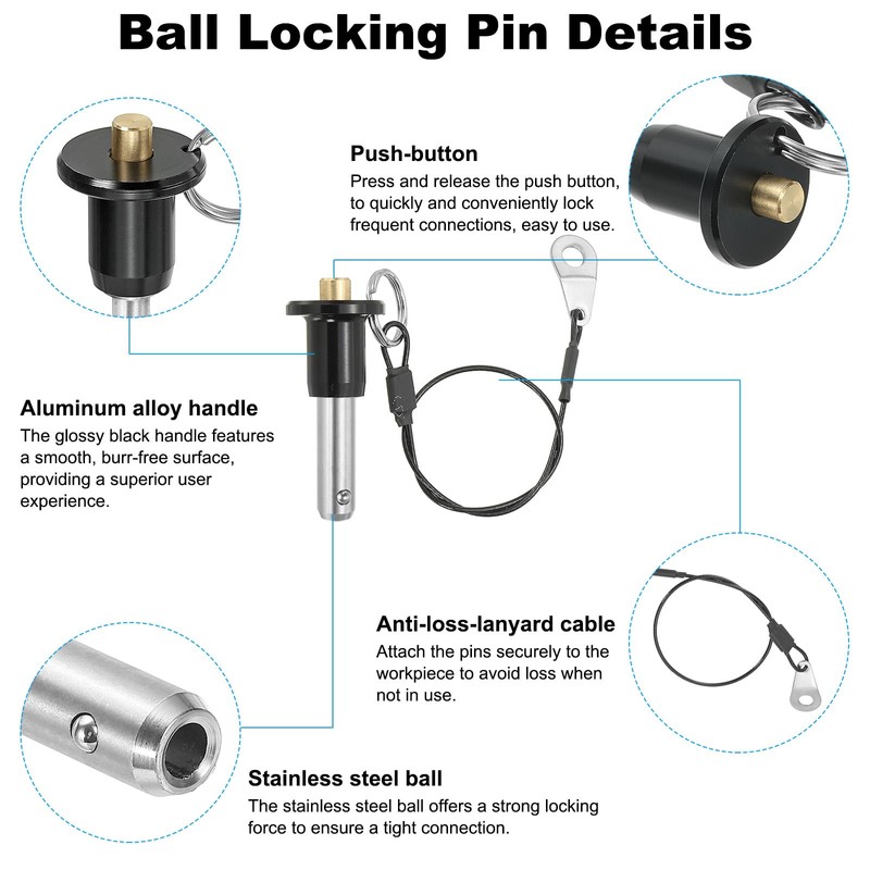 - Design Feature: with double steel beads and a 25 cm safety cord, enhancing locking security, preventing loss, and facilitating portability. The ball-locking pin with a push button can quickly and conveniently lock frequent connections, suit various high-precision positioning, and plug and unplug