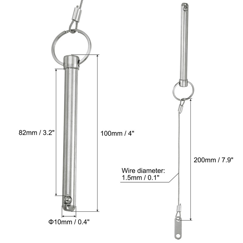 - Color: Silver; Material: Carbon Steel; Diameter: 10mm / 0.4inch; Total Length: 100mm / 4inch; Effective Length : 82mm / 3.2inch; Wire length: 200mm / 7.9inch; Wire diameter: 1.5mm / 0.1inch; Packing List: 2pcs x Quick Release Pin