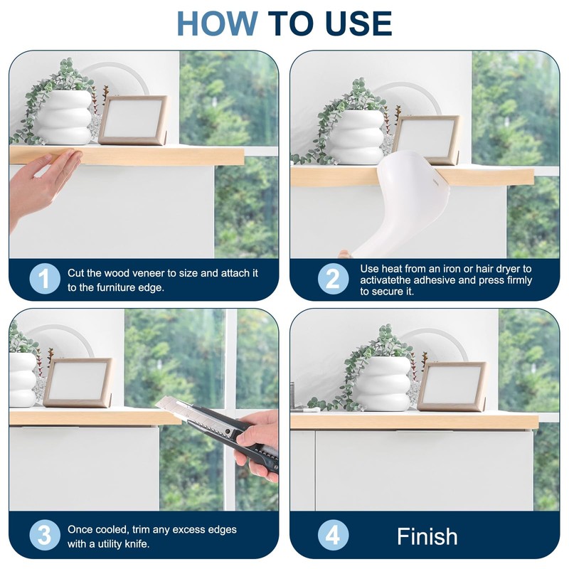 - Instruction: 1. Cut the wood veneer to size and attach it to the furniture edge. 2. Use heat from an iron to activate the adhesive and press firmly to secure it. 3. Once cooled, trim any excess edges with a utility knife.