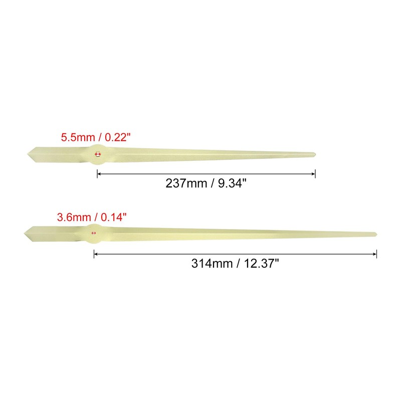 - Material: Aluminum; Suitable for Shaft diameter of the movement Hour hand:3.6mm / 0.14inch; Suitable for Shaft diameter of the movement Minute hand: 5.5mm / 0.22inch; Length from hole to needle tip: Hour hand: 237mm / 9.34inch; Minute hand: 314mm / 12.37inch