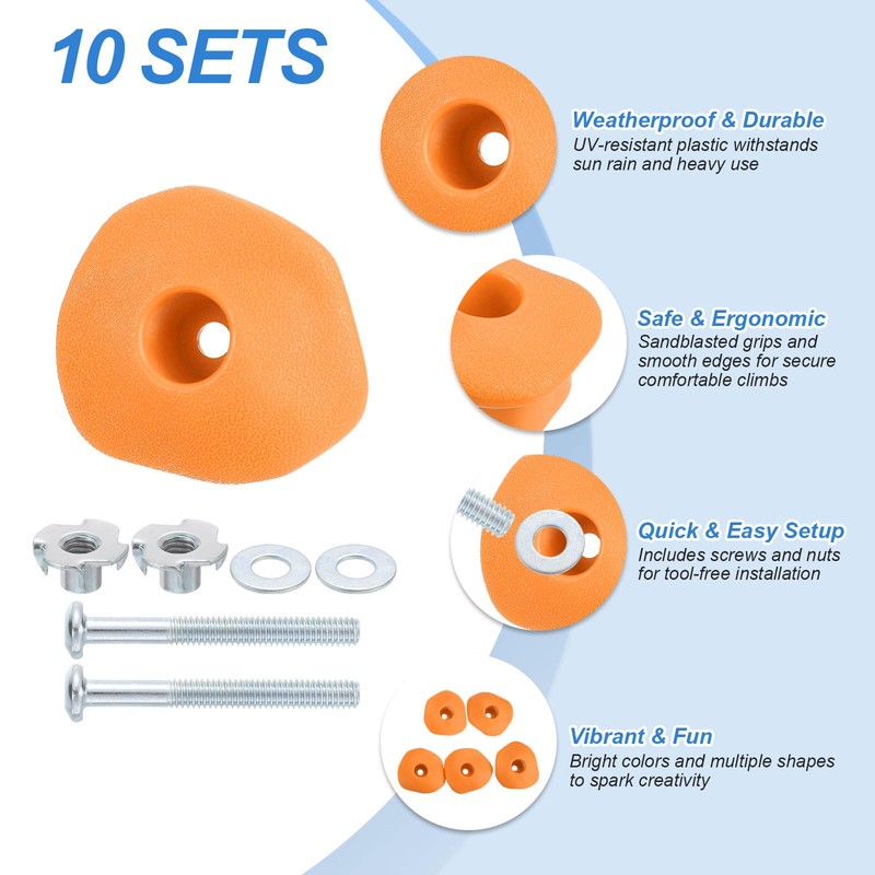 • Advantage: 1. Weather-resistant and Durable: plastic holds withstand the sun, the rain, and heavy use without cracking or fading. 2. Secure and Ergonomic: Sandblasted anti-slip grips and smooth edges ensure secure, comfortable climbing. 3. Easy to Set Up: Includes screws and nuts for quick, tool-free installation. 4. Vibrant and Fun: 5 bright colors and multiple shapes inspire creativity and active play.
