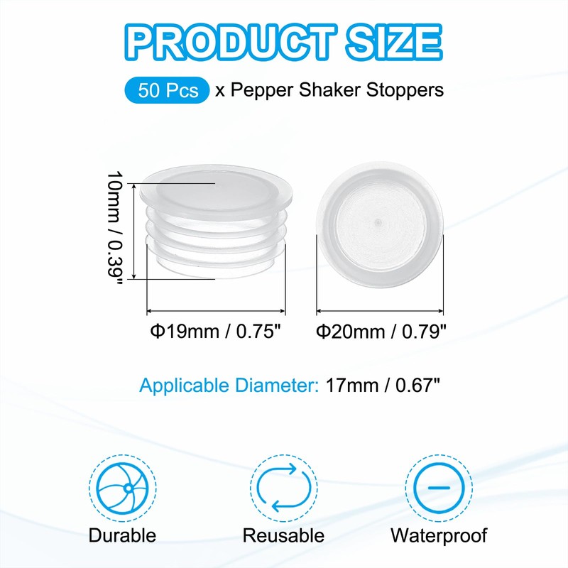 - Color: Clear; Material: PE Plastic; Applicable Diameter: 17mm / 0.67 inch; Thread Diameter: 19mm / 0.75 inch; Outer Diameter: 20mm / 0.79 inch; Packing List: 50Pcs x Pepper Shaker Stoppers