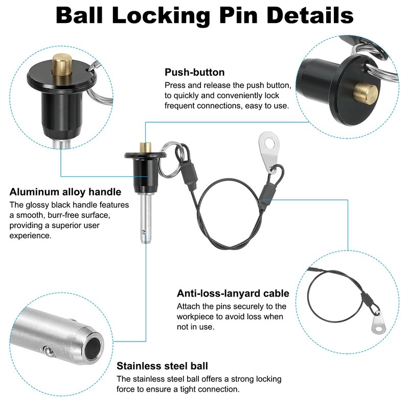 Designmerkmal: Mit doppelten Stahlperlen und einem 25 cm Sicherheitsseil, das die Verriegelungssicherheit verbessert, Verlust verhindert und die Tragbarkeit erleichtert. Der Kugelarretierungsstift mit Druckknopf kann häufige Verbindungen schnell und bequem verriegeln, verschiedene hochpräzise Positionierungen ermöglichen und einstecken und ausstecken.