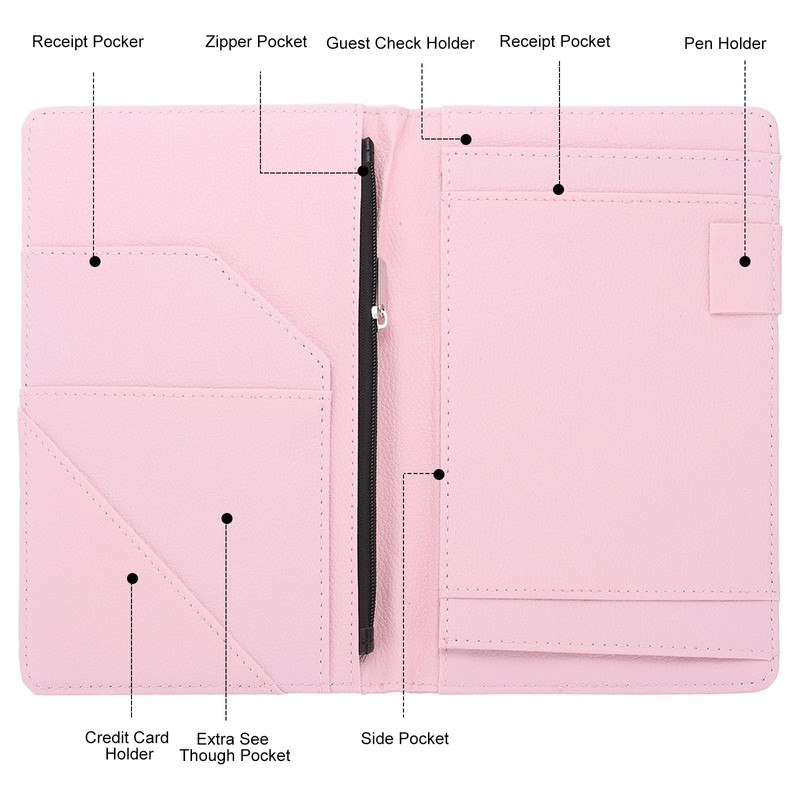 PATIKIL Server Book Organizer with Zipper Pocket, 2 Pcs 8" x 5" Restaurant Check Presenters Guest Check Card Holder for Server Waiter Waitress, Pink