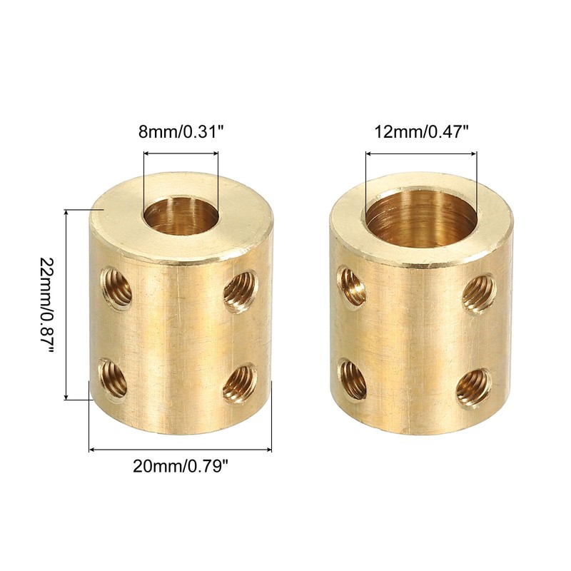 - The rigid Coupling, we provide here, are in the size of: Material: Brass; Color: Gold; Screws Size: M5*0.8; Bore size: 8mm to 12mm/0.31inch to 0.47inch; Total Size: 22mm x 20mm/0.87inch x 0.79inch(L*D)