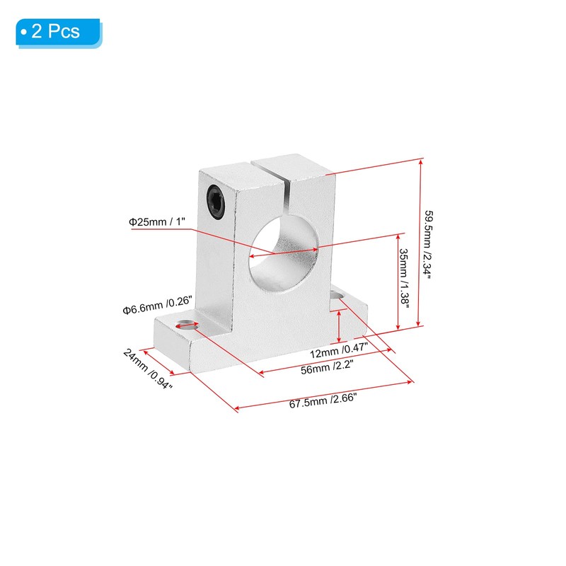 - Model: SK25; Fit for Shaft Dia: 25mm / 1 inch Overall Size: 67.5 x 24 x 59.5mm / 2.66 x 0.94 x 2.34 inch (L*W*H); Hole Center Height: 35mm / 1.38 inch; Base Thickness: 12mm / 0.47 inch; Mount Hole Distance: 56mm / 2.2 inch; Mount Hole Dia: 6.6mm / 0.26 inch