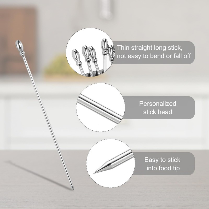 - Advantage: Metal cocktail picks can greatly enhance the appearance of drinks from small details. The martini pick sticks are designed with delicate round ball heads, and smooth and rounded, metal texture, each stirrer end is designed to be sharp and smooth, allowing you to penetrate fruits and foods effortlessly