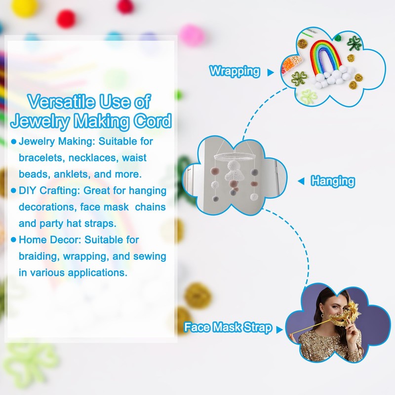 - Application: Stretchy string is widely use for bracelets, necklace, beading, jewelry making, drawstring bags, hair ties, party hat straps, DIY crafting and so on