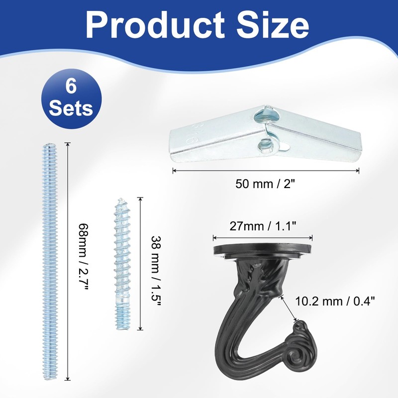• Material: Zinc Alloy; Total length: 38mm / 1.5 inches; Bottom width: 27mm / 1.1 inches; Packing List: 6 Pcs x Ceiling Hook, 6 Pcs x Long Bolt, 6 Pcs x Zinc Plated Screw, 6 Pcs x Toggle Wing, 6 Pcs x Expansion Bolt