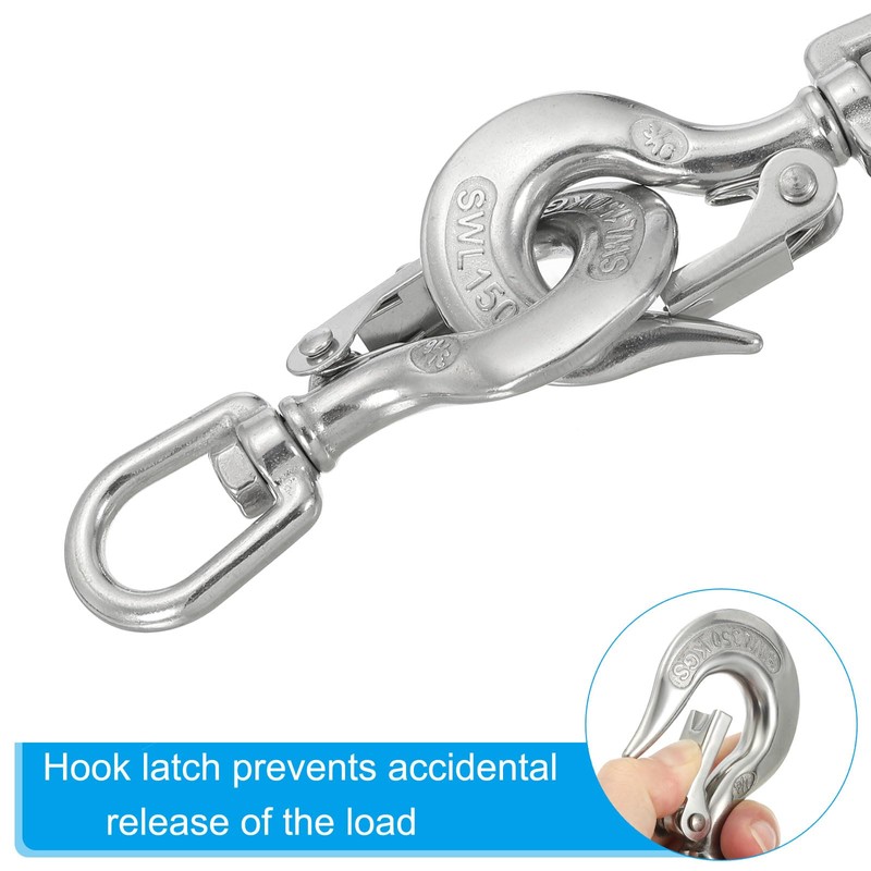 - Instruction: Latch hooks provide convenient and efficient rope or chain connection. The latch ensures that ropes, chains, and fittings remain securely attached to the hook, preventing any accidental separation.