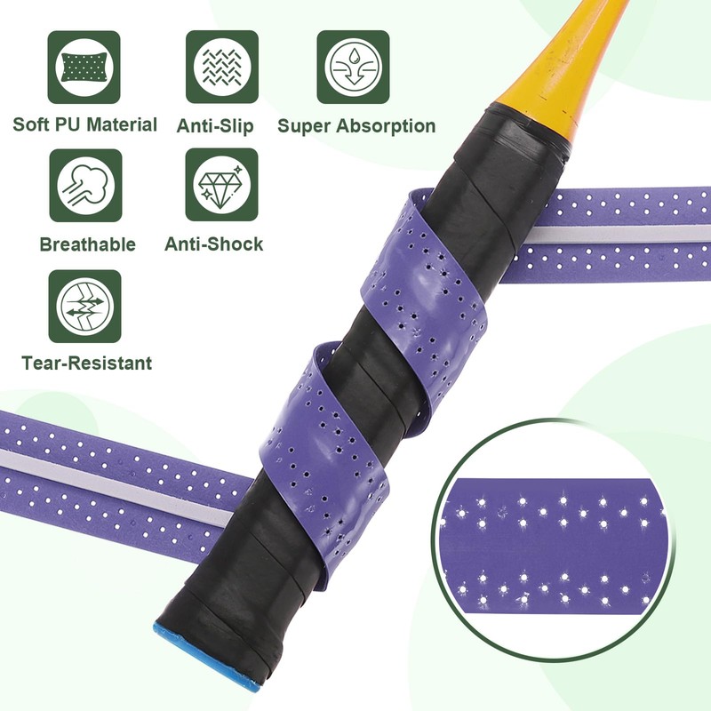 - Advantage: The racket grip tape is made of durable PU material with EVA ridges, which is elastic, anti-shock, anti-skid, strong sweat absorption, tear-resistant and non-fading. There is double-sided tape on the end of the grip tape, convenient for fixing the tape on the racquet.