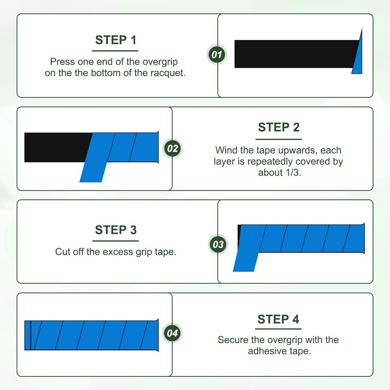 - Instruction: 1. Press one end of the racket grip tape on the side of the bottom of the racquet; 2. Wind the tape upwards, and the edge of each layer is repeatedly covered by about 1/3; 3. Cut off the excess grip tape and secure the top with the attached double-sided tape.
