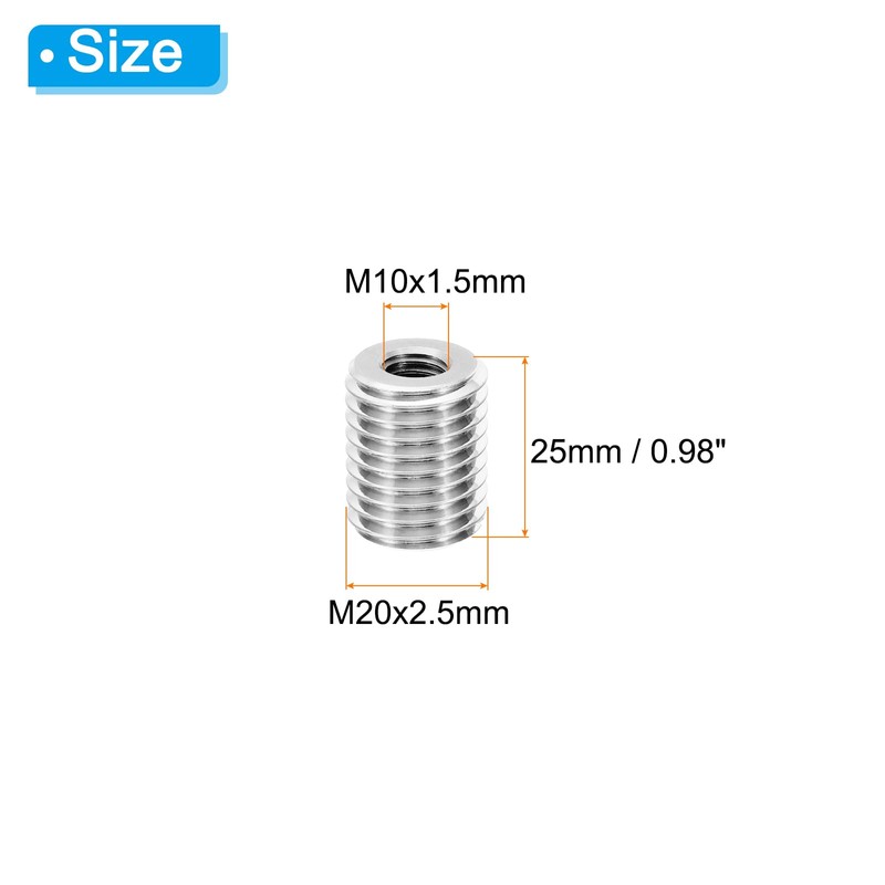- Specifications: Color: Silver Tone; Material: Stainless Steel; Surface Treatment: Zinc Plated; Female Thread Size: M10 x 1.5mm; Male Thread Size: M20 x 2.5mm; Length: 25mm/0.98"; Package List: 2 Pcs x Stainless Steel Reducing Nut Thread Insert.