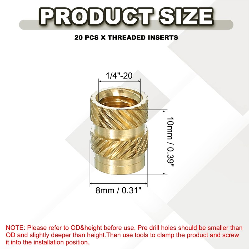 - Thread Size: 1/4"-20; Total Size: 8 x 10 mm / 0.31 x 0.39 inch (OD x H); Packing List: 20 Pcs x Threaded Inserts