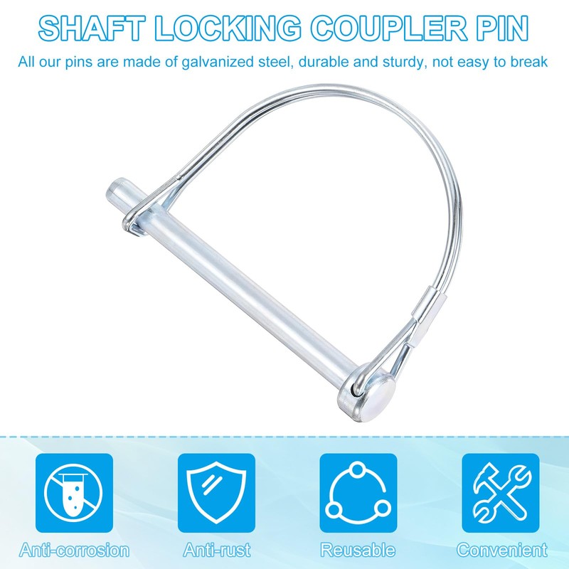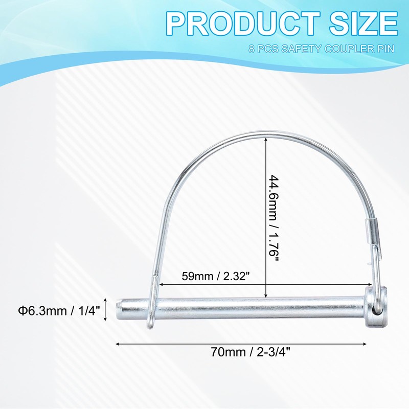 - Color: Silver; Material: Carbon Steel; Inner Length: 44.6 mm/1.76 Inch; Inner Width: 59 mm/2.32 Inch; Size: 6.3 x 70 mm/1/4 x 2-3/4 Inch(DxL); Packing List: 8 Pack x Trailer Coupler Pin