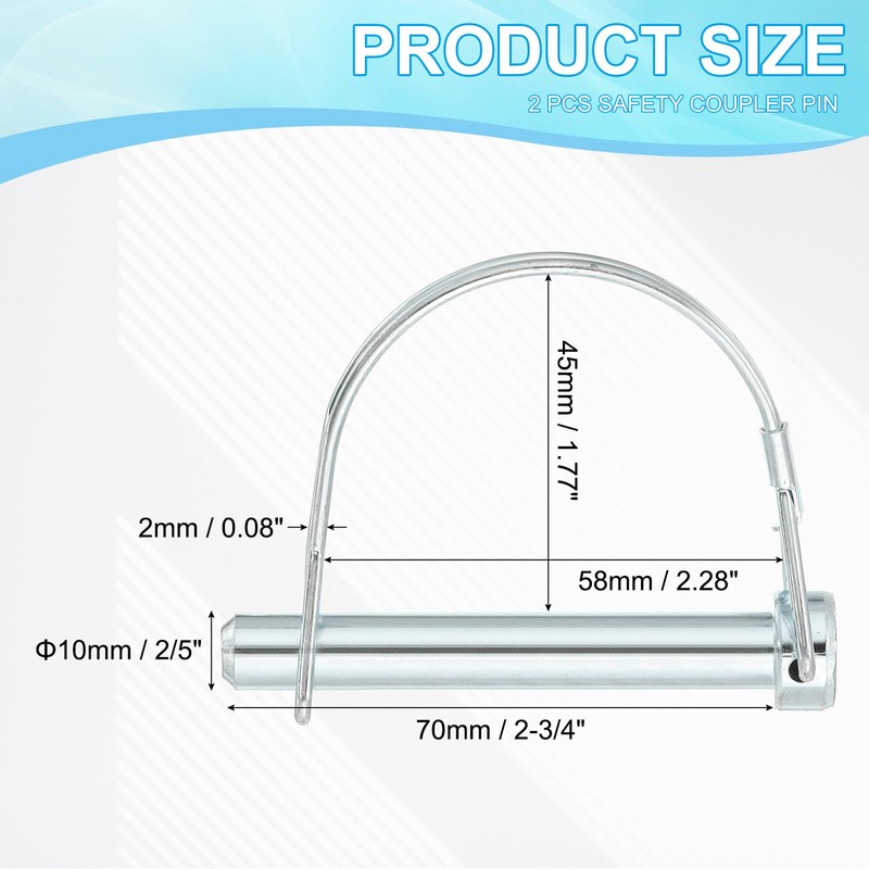 - Pins Diameter: 10 mm / 2/5"; Pins Length: 70 mm / 2-3/4"; Coil Diameter: 2 mm / 0.08"; Packing List: 2 x Trailer Safety Pin