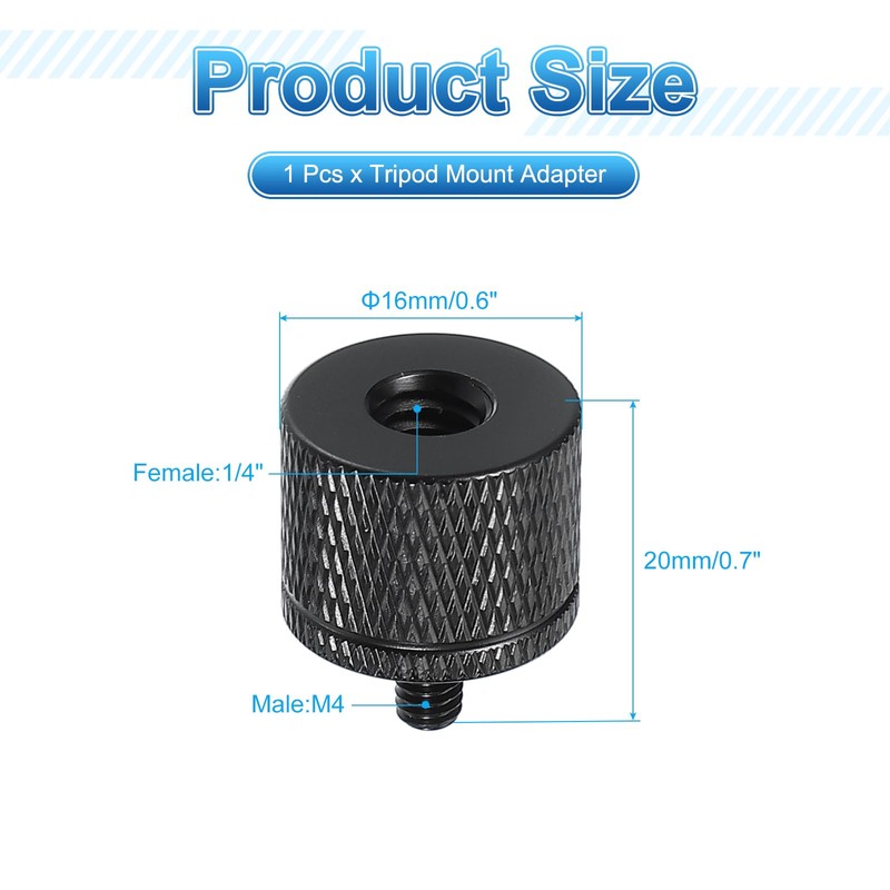• Size: 16 x 16 x 20 mm / 0.6 x 0.6 x 0.7 Inch (L*W*H); Thread Size: 1/4 Inch Female to M4 Male; Packing List: 1 Pcs x Tripod Mount Adapter