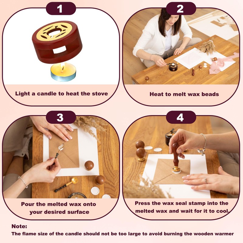 - Instruction: Wax seal stamp kit is good for beginners and experts alike. Simply heat the warmer, melt your favorite wax seal, and pour it onto your desired surface. Then, press your favorite wax seal design into the melted wax and wait for it to cool.