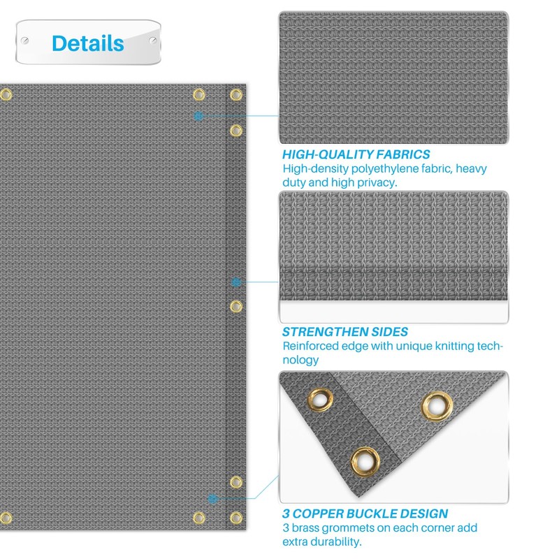 • Rustproof Grommets: The grommets were made of brass, and placed evenly on all 4 sides for easy installation. The 3 grommets on each corner secure position on the deck or chainlink fence and add extra durability.