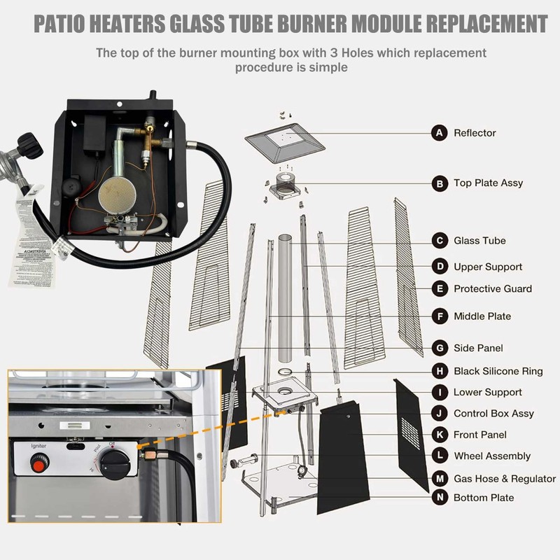 - 3 Bolt Hole Patio Heaters Glass Tube Burner Module Replacement: Patio heater replacement parts 47000 BTU Max heating element control box, to spread heat up to an 10-foot diameter from its central heating position and it is powerful to heat rapidly in 5 minutes. more energy-efficient and environmentally friendly