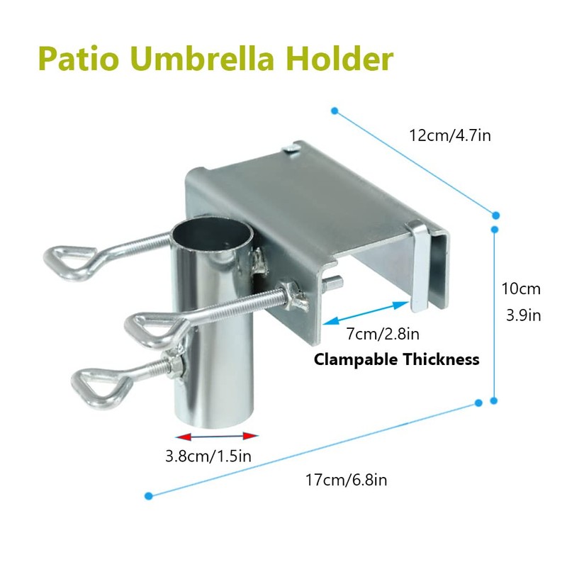- [Space Saving] - Heavy-duty balcony Patio Umbrella Clamp is a good size(6.8x3.9x4.7in) and won't take up space. Umbrella Clamp will allow for more space on your deck, patio, and Balcony. If you are looking for a replacement for a heavy & huge umbrella holder, this is definitely your smart choice