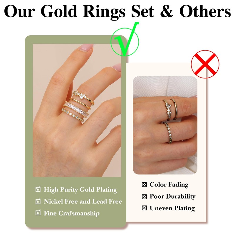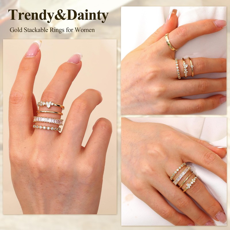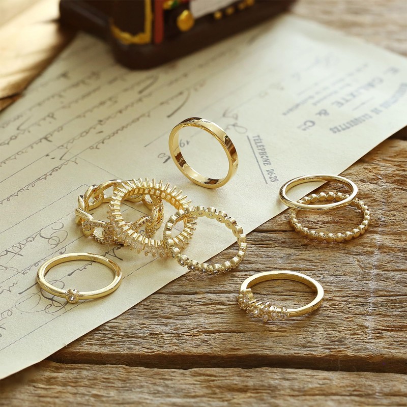 - Gold Rings For Women: One order includes 8pcs different style gold plated stackable rings. Each gold ring is super sparkly and fashion-designed. So cute, simple, trendy, and dainty, making you more elegant and refined