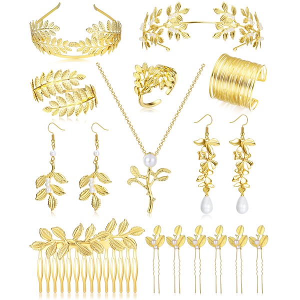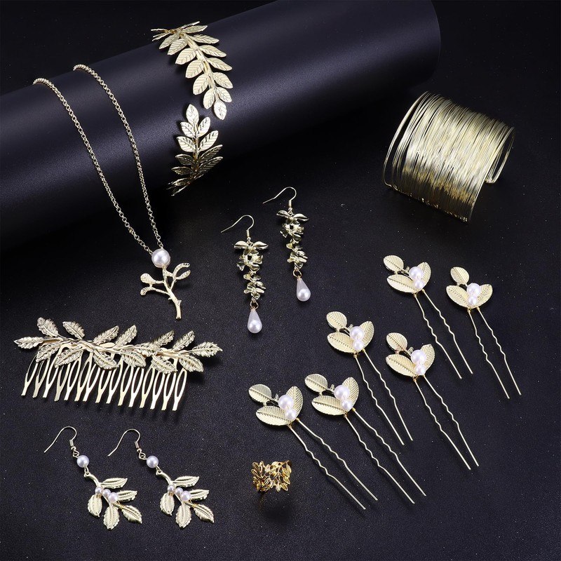 - Greek Goddess Costume Accessories:The toga costume jewelry set include 6 pcs leaf hair pins, 4 pcs leaf dangle earrings, 2 pcs golden laurel leaf headband, 1 pcs laurel leaf upper armband, 1 pcs coil cuff bracelet,, 1 pcs pearl necklace, 1 pcs laurel leaf ring, 1 pcs leaf hair comb, elegant goddess costume accessory that will make you feel like a real greek empress or princess