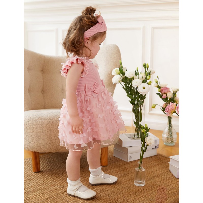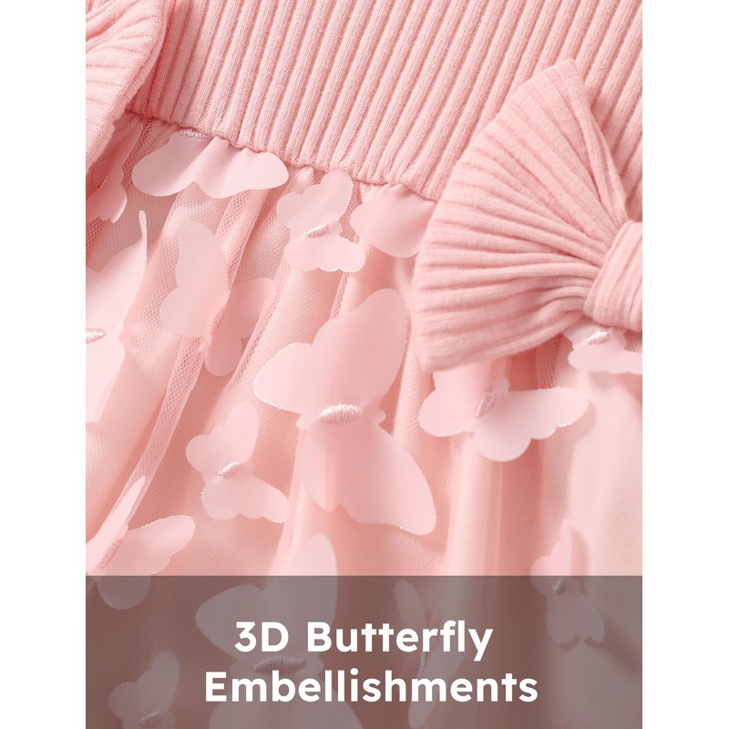 PATPAT 2pcs Baby Girl Ribbed Knit Flutter-Sleeve Splicing 3D Butterfly Applique Tulle Dress with Headband Set Pink 12-18 Months