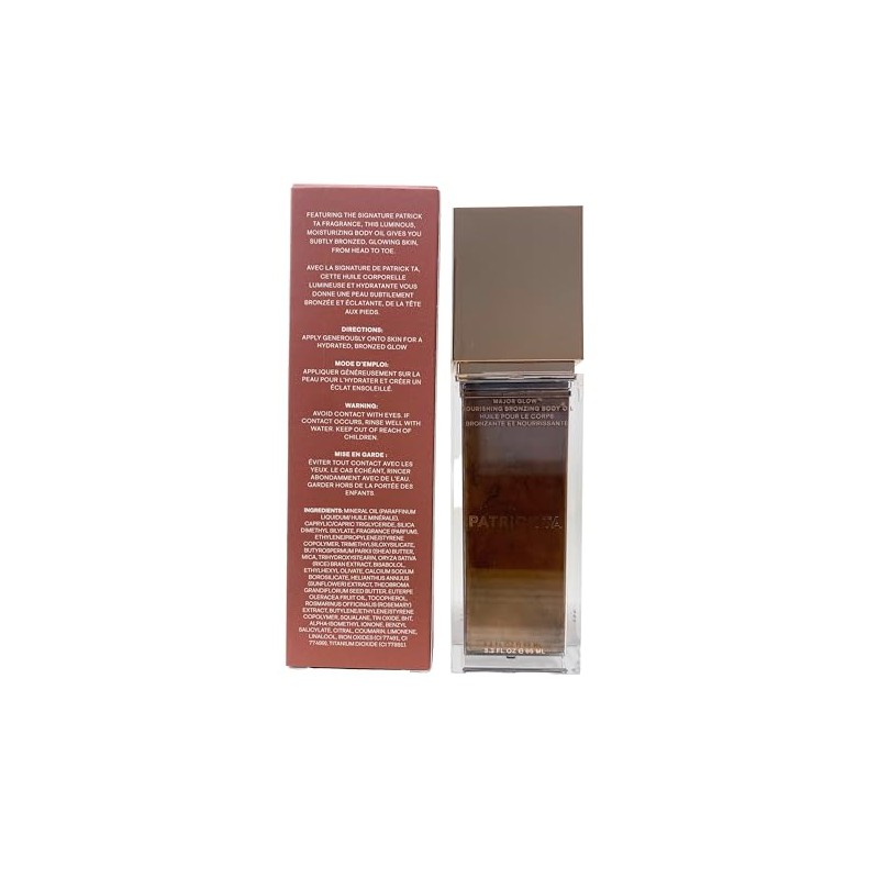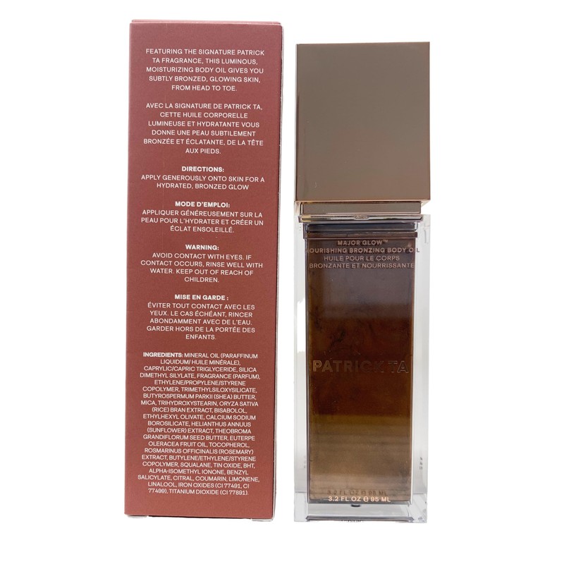 Patrick Ta Major Glow Nourishing Bronzing Body Oil (3.2 Fl Oz / 95 mL) The golden touch for a bronzed body. Bask in the glow of this luxurious oil, infused with golden warm pearls and high-performing ingredients for moisture, shine, and enhanced skin elasticity. It's quick to absorb, leaving you sunlit and scented with notes of bergamot, jasmine, and sandalwood