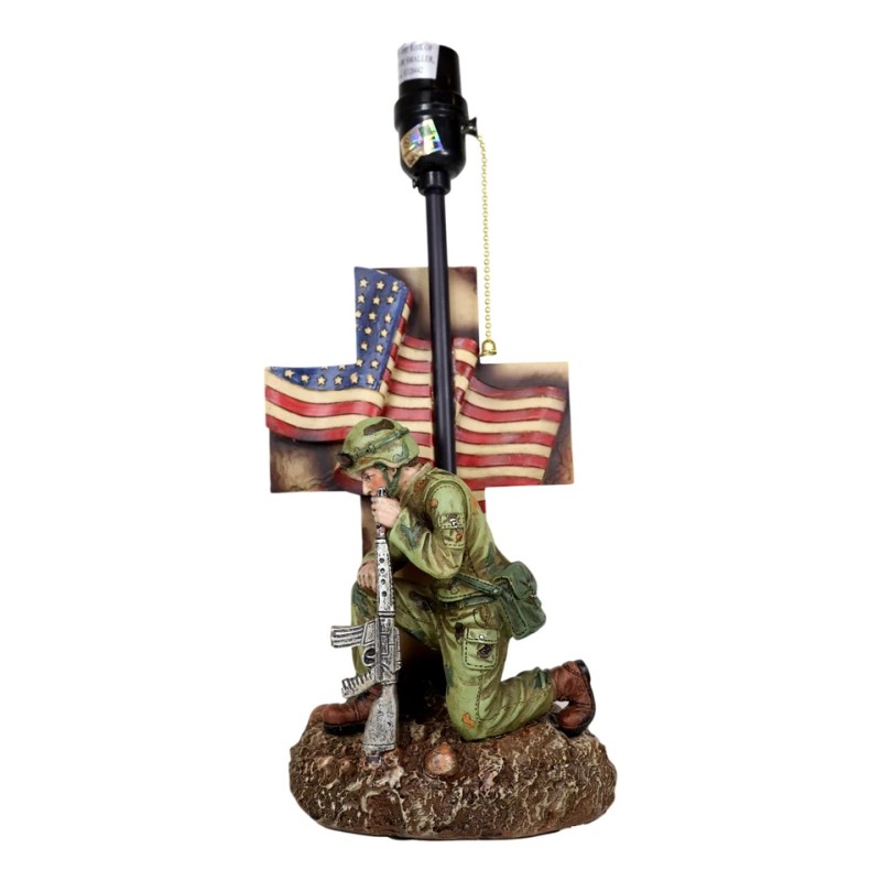 • Let's take a moment of silence in honor of the brave warriors that ensured our freedom. This memorial sculpture features a warrior kneeling by his rifle next to a tall cross decorated with an American flag. This table lamp will fill your room with light as well as proud memories of the fallen heroes who had fought for our freedom.