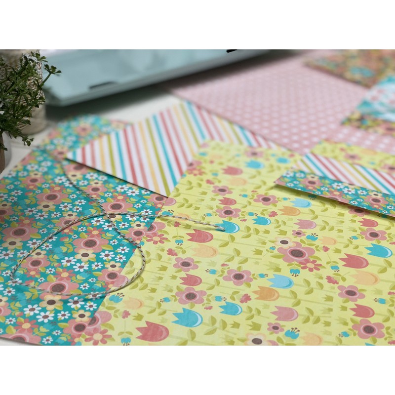 The Spring Has Sprung paper pack has a wide variety of Patterns including Polka Dots, Stripes, Plaid, Check, Flowers, Tulips, Bees, Sun, Ladybugs, Clouds, and Bugs.