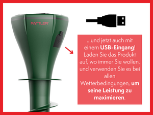 - Increased effect thanks to screw design: the PATTLER mole deterrent has an innovative design, which emits the sound waves more effectively into the environment. The devices cover up to 800 m² in combination.