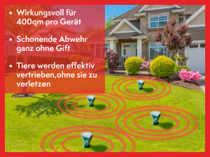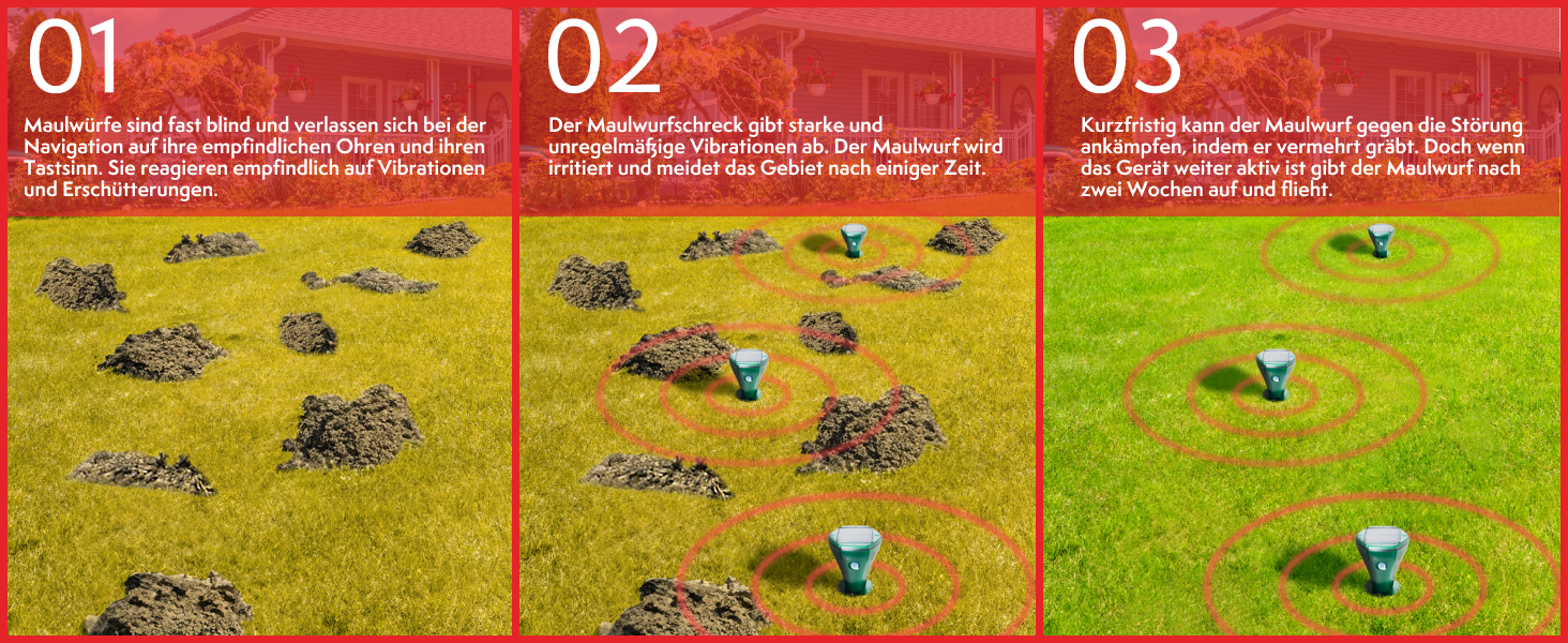 - Dynamic defense: the mole repeller uses an intelligent frequency change system. Pests cannot accustom them to the tones and are effectively driven away.