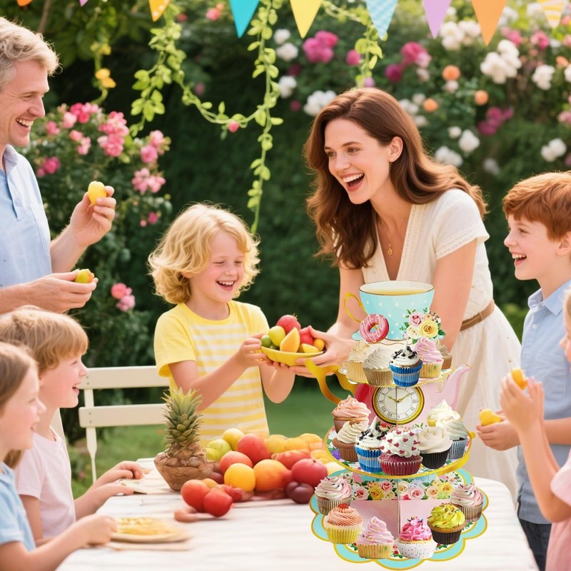 - The tea party cupcake stand is designed in the charming shapes of a vintage teapot and teacup, adorned with soft tones and playful floral patterns — evoking the feeling of an afternoon tea party in a romantic garden.