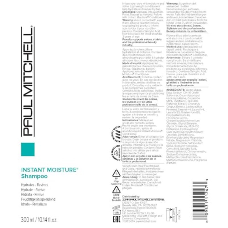 Product DescriptionInfuse your style with moisture and shine. Paul Mitchell Instant Moisture Shampoo instantly hydrates and cleanses dry hair in a color-safe formula. This moisturizing shampoo contains panthenol and jojoba to help strengthen and hydrate moisture-loving strands. Instant Moisture Complex provides superior conditioning and UV protection helps shield vulnerable hair from the sun. Adds body and helps repair damage from the inside out.Hair Type: Ideal for Dry Hair.Benefits : Color Safe. Vegan. Paraben Free. Made without Gluten. UV Protection.Fragrance: Fresh energetic notes of lemon and orange blended with subtle lavender and aromatic mint.Brand StoryPaul Mitchell is results-driven hair care from John Paul Mitchell Systems—the leader of salon-quality products committed to the professional beauty industry. Every purchase supports JPMS salons with a commission.