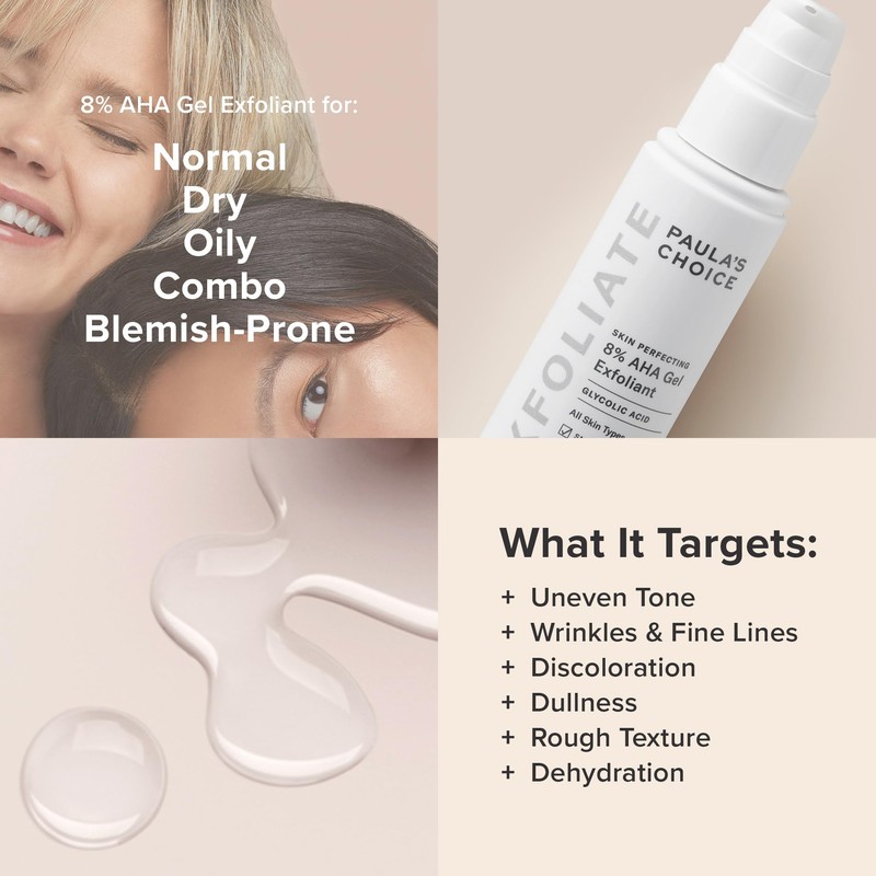 - Paula's Choice SKIN PERFECTING 8% AHA Gel Exfoliant with Glycolic Acid, Chamomile, and Green Tea can help minimize the look of discolorations and age spots, and with consistent use can increase skin's firmness. Use after cleanser and toner twice daily.