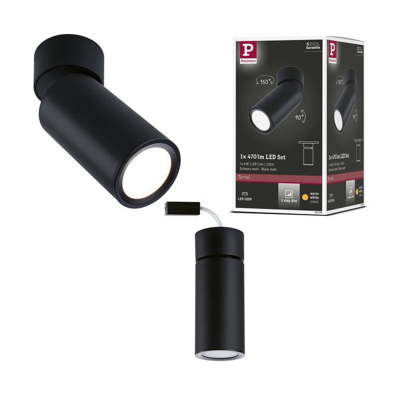 Paulmann Turnal 93089 LED Ceiling Light 470 lm 3-Step Dim Swivelling Round Including 1 x 6 Watt Dimmable Ceiling Light Black Matt Metal 2700 K Coin
