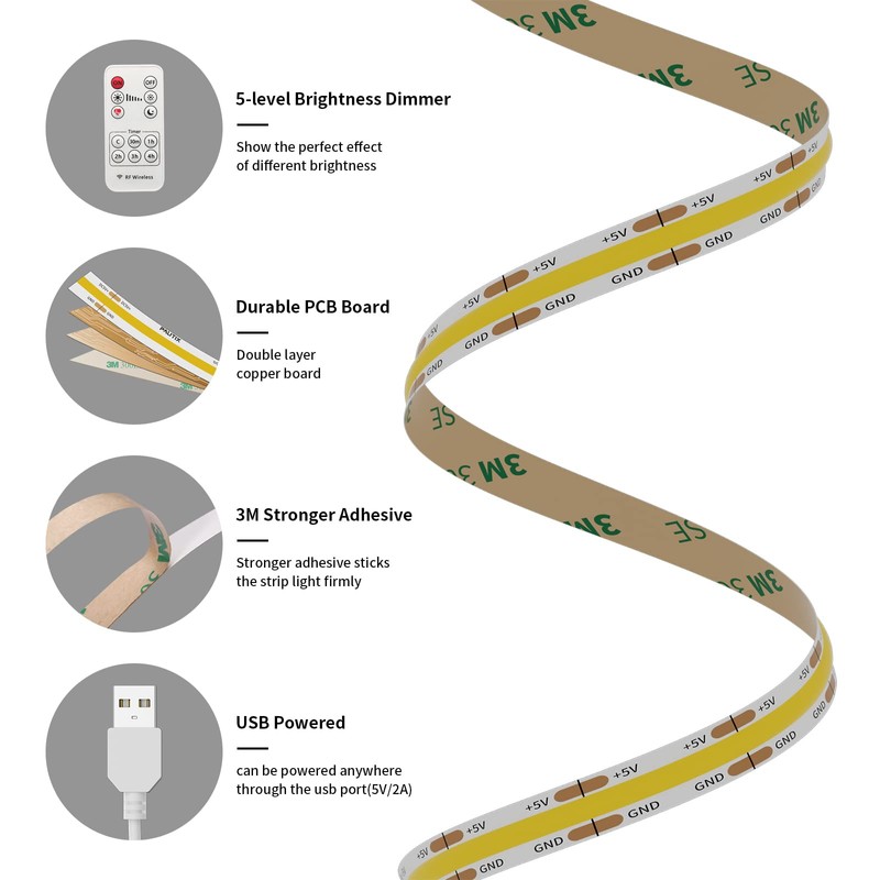 - 【Dimmable Brightness and Memory Function】RF Remote and in-line 3-button dimmer for 5-level brightness adjustment.With memory function,this USB powered cob led strip restores to its last setup to save your time effectively.PAUTIX 5V warm white USB COB led lights strip is ideal for daily use