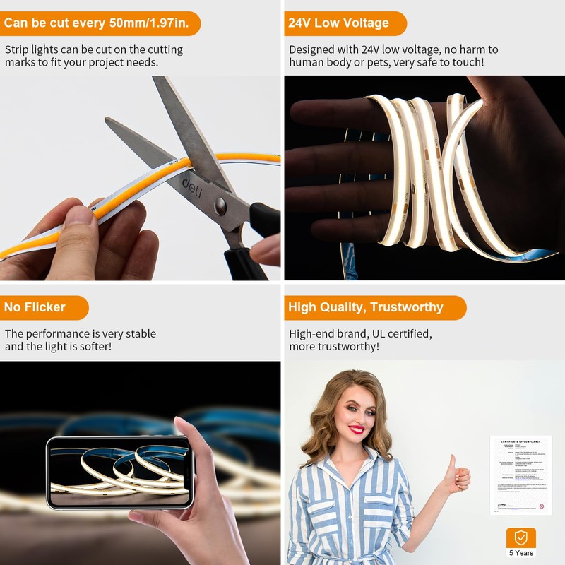 - 【Lead-free Materials & UL Listed】Designed with lead-free materials, PAUTIX COB LED strip lights are more environmentally friendly and protect your health than others. 24V low voltage no longer worry about electric shock, safer to use; low power consumption, energy saving. UL Listed, the quality is more trustworthy!