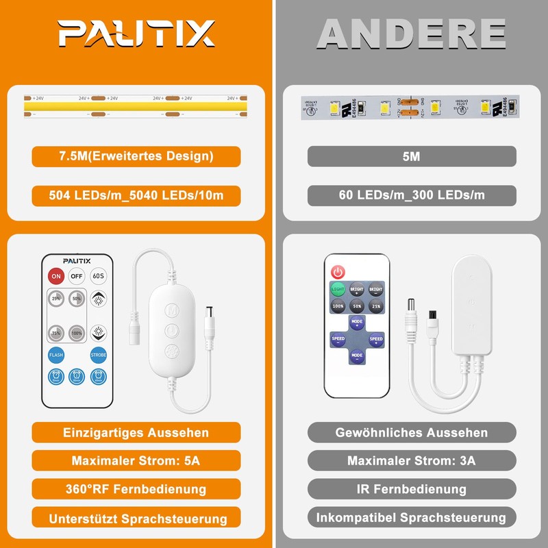 • WiFi connection: compared to normal RF remote control, PAUTIX 7.5 m COB LED strip light kit with WiFi connection, with Tuya app, if you have third-party voice devices, you can use them to control the strip, such as turn on/off, adjust brightness and set timer that make your life smart. The controller can support max 5A current, which is different with other 3A controllers, the RF remote control is pauti. x x exclusive exclusive appearance designAll make the strip unique.