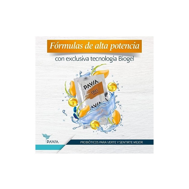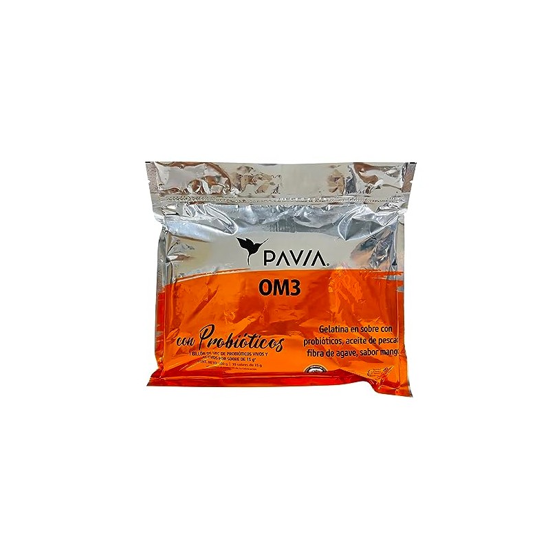 PAVIA Probiticos vivos con Omega 3Prebiticos y AntioxidantesAyuda a mejorar la concentracinSin azcarSabor Mango 1 billn de probiticos Mejora la...