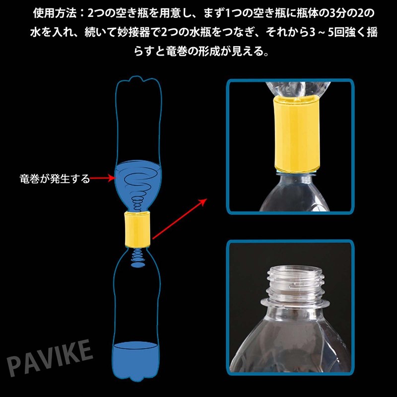 - (Application Instructions) Fill an empty bottle with 2/3 of water, connect the two bottle mouth with the connector, then shake it 3 to 5 times. The result is a very interesting tornado