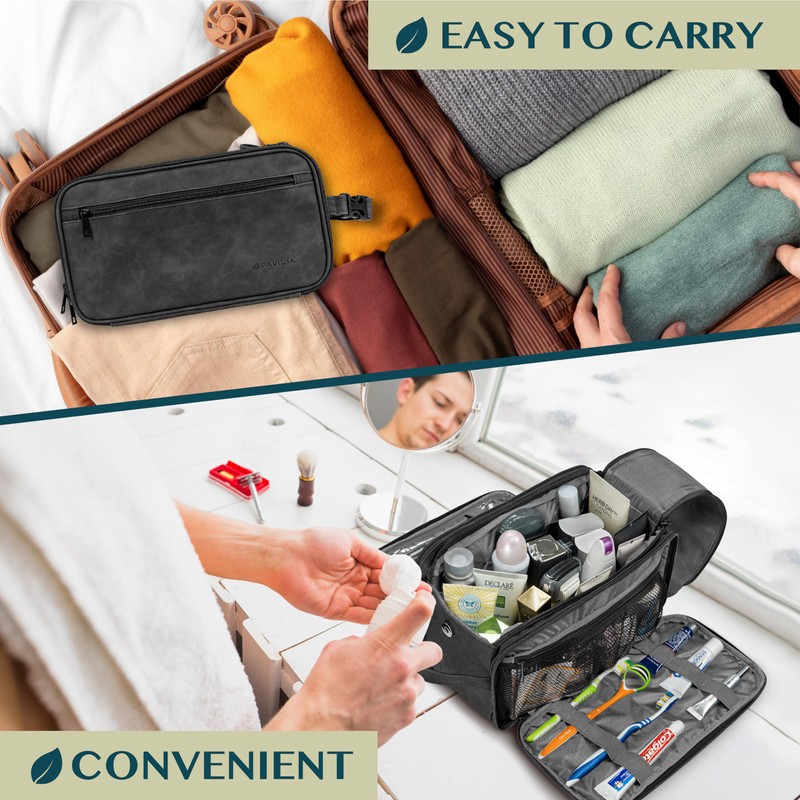 PAVILIA Toiletry Bag for Men, Leather Travel Shaving Leather Dopp Kit | Large Organizer with Clip-on Buckles and Double Zippers